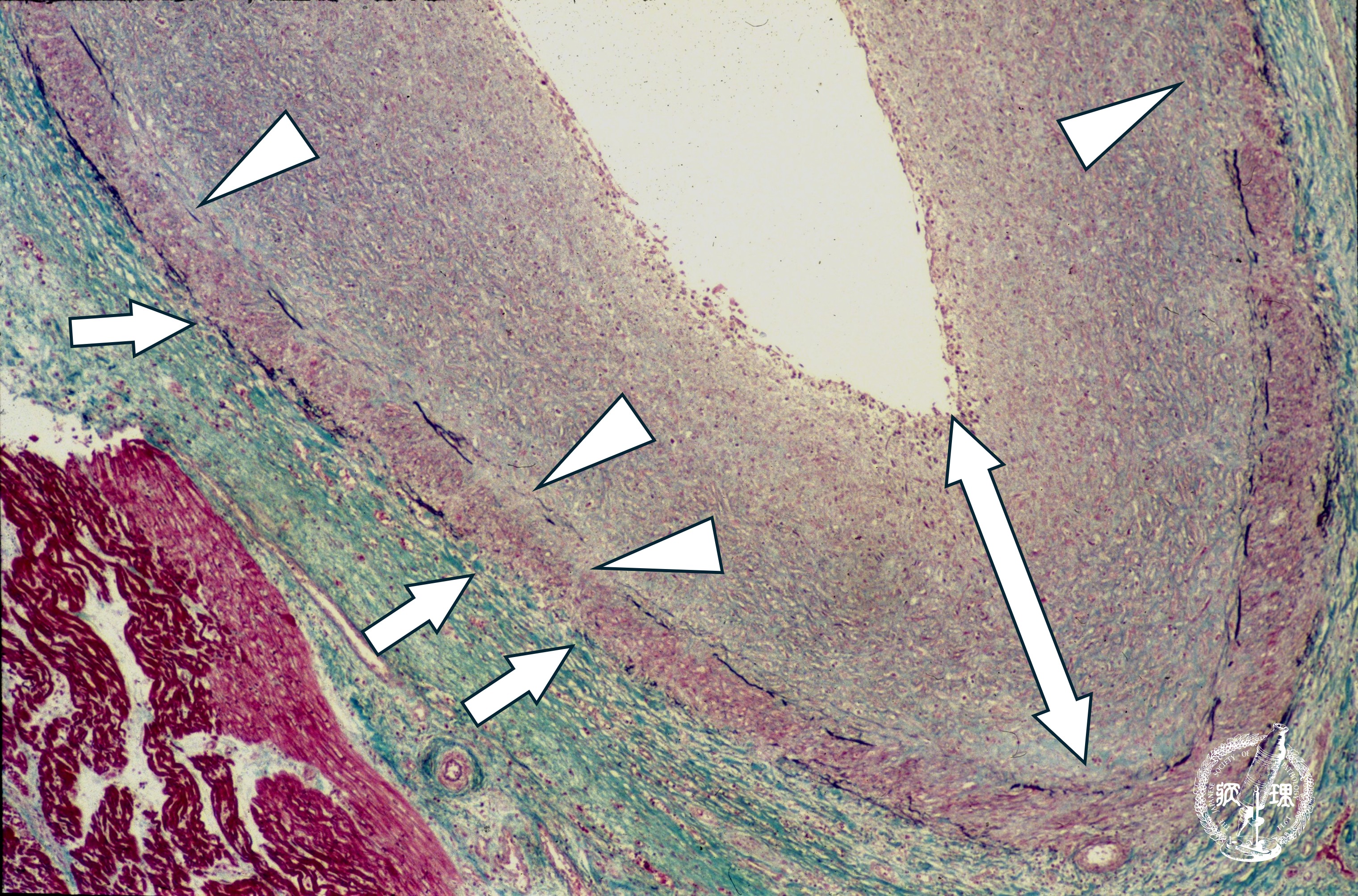 ミクロ像 (Elastica-Masson染色): 外弾性板の断裂(矢印)、内弾性板の断裂・消失(矢頭)とともに内膜の著明な肥厚(両矢印)を認める。