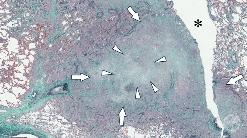 ミクロ像 (Elastica-Masson染色 弱拡大):肺実質の破壊、空洞形成(*)を伴う壊死性肉芽腫性病変。弾性線維の消失(矢印)とともに無構造な壊死組織(矢頭)を認める。