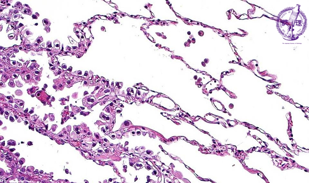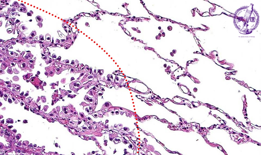 ミクロ像(HE強拡大):腺癌の辺縁では、既存の肺胞上皮細胞を置換性しながら増殖することが多く、肺胞構造を破壊していない。 正常上皮との境界(点線)は明瞭である。