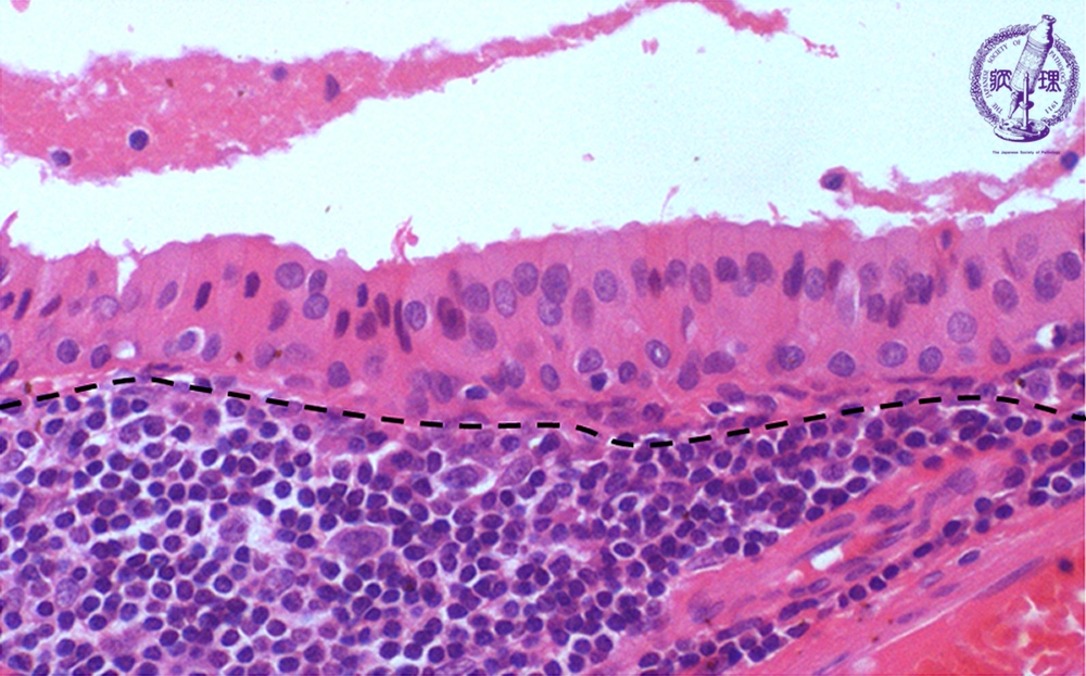 ミクロ像(HE強拡大):腫瘍細胞は、好酸性顆粒状の細胞質を有するオンコサイトである。腔に面する高円柱状細胞とその下の立方形細胞が2列に並んでいる。間質(点線下方)は、リンパ性組織である。