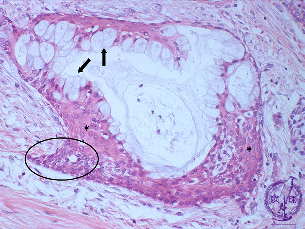 ミクロ像(HE強拡大):粘液産生細胞(矢印)と類表皮細胞(*)が主体で、細胞異型や分裂像には乏しい。分化の明らかでない小型の中間細胞(円内)も少数認められる。