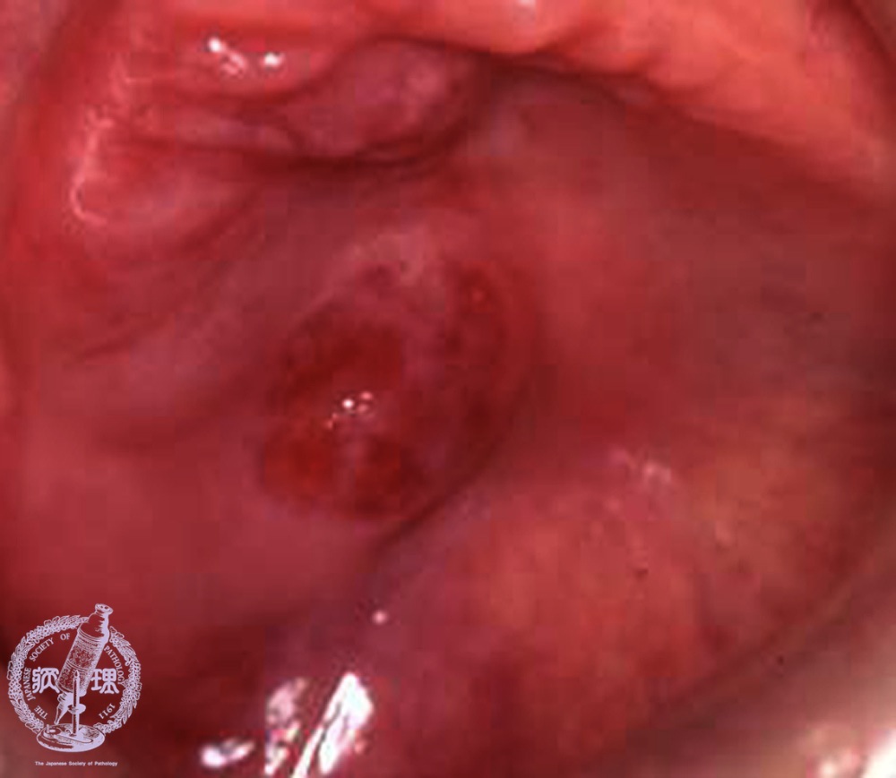 マクロ像:口腔内写真。口蓋に潰瘍形成を伴う腫瘤が認められる。周囲組織との境界は不明瞭である。