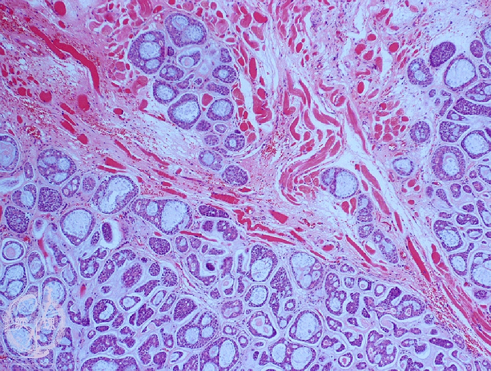 ミクロ像(HE弱拡大):多数の篩状、管状胞巣が筋組織内(*)に浸潤性に増殖している。