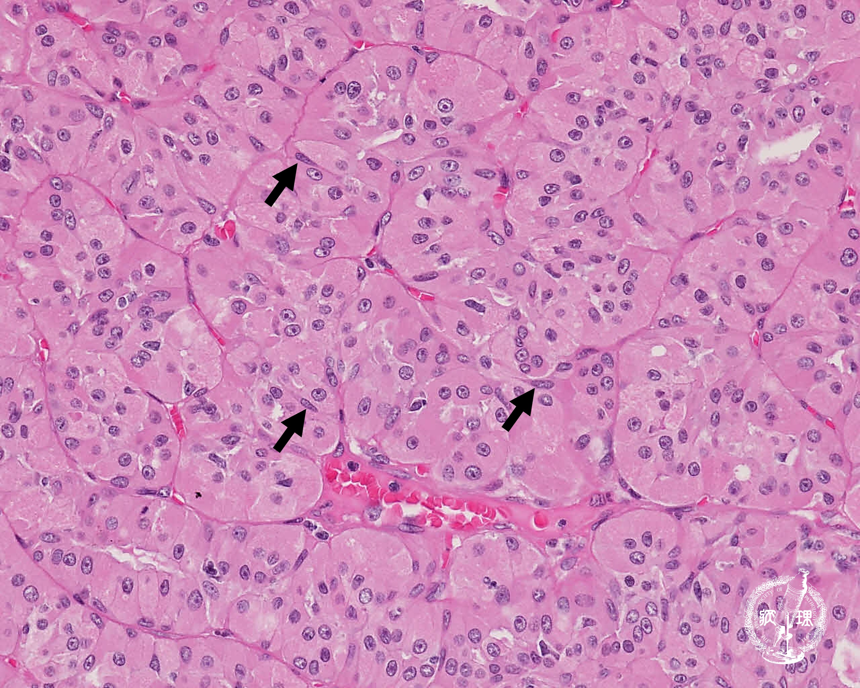 ミクロ像(HE強拡大):好酸性の豊富な細胞質を有する細胞(light cells)が胞巣状構造を呈し増殖している。細胞質の好酸性がより強く、核が濃縮状の細胞(dark cells)も散在性に混在する。腫瘍細胞間の間質は狭く、毛細血管が介在する。
