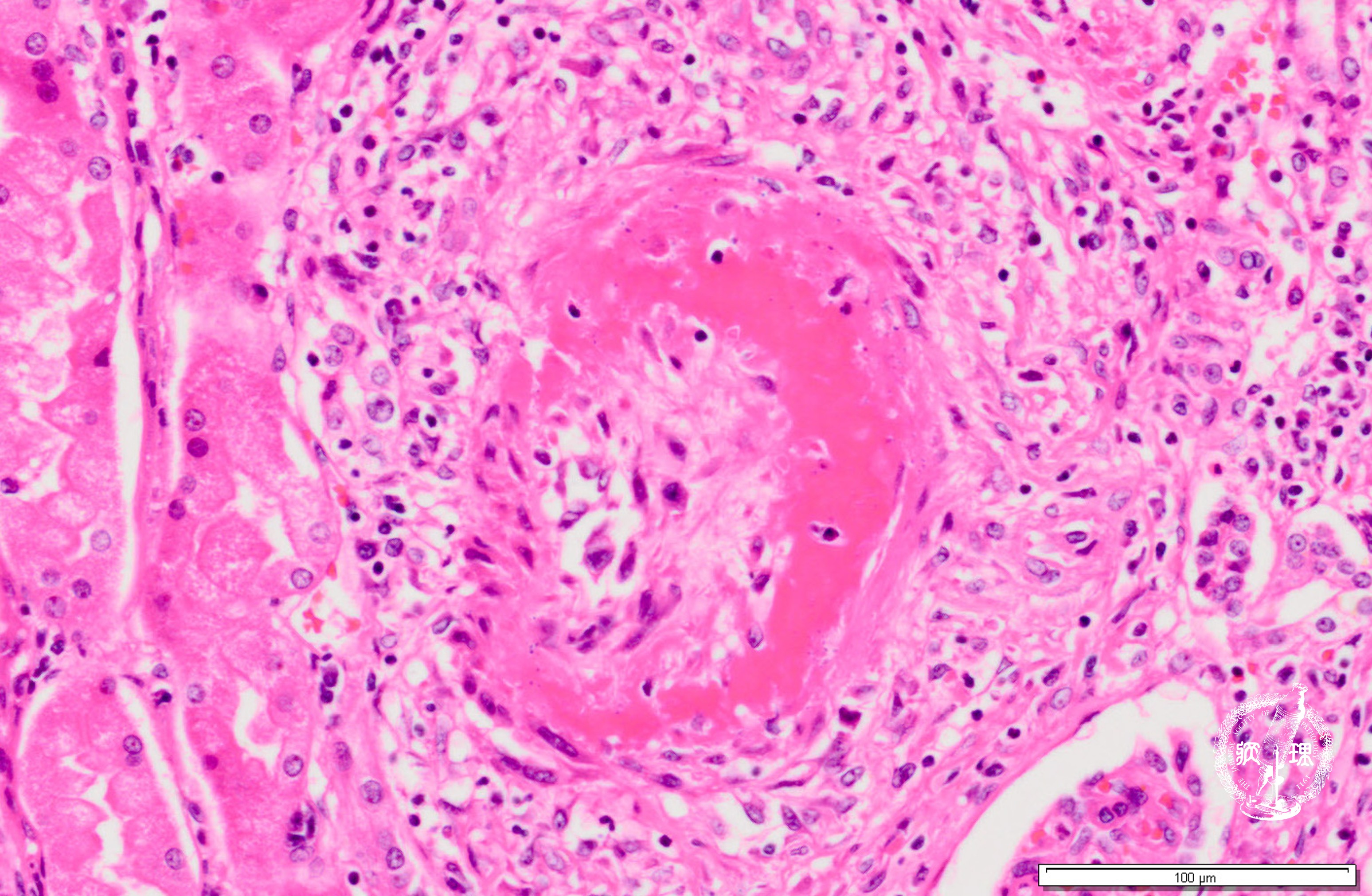 ミクロ像 (HE強拡大): フィブリノイド壊死(矢印)を伴う壊死性血管炎。著明な内膜肥厚(両矢印)を認める。