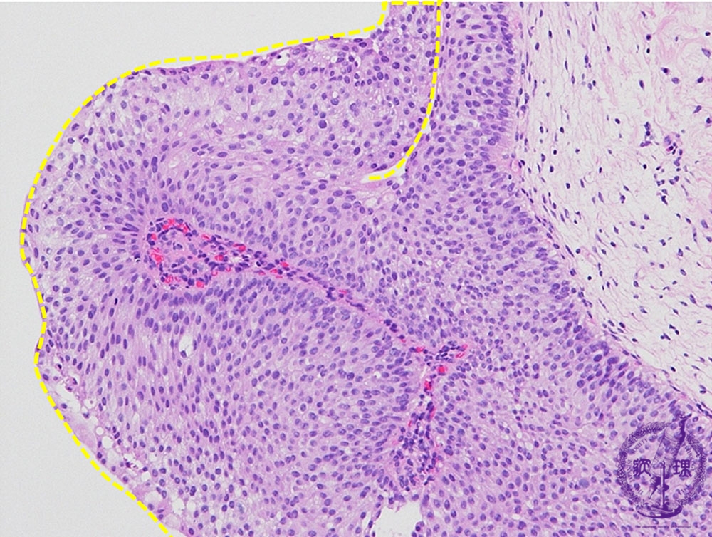 ミクロ像(HE中拡大):大部分の尿路上皮癌は乳頭状(黄色点線)に増殖する。また、粘膜下で内反性に増殖する場合もしばしばみられる。異型度により、Grade 1(軽度異型)、Grade 2(中等度異型)、Grade 3(高度異型)に分類される。Grade 1(軽度異型)では、尿路上皮は7層を越え多層化を示す。