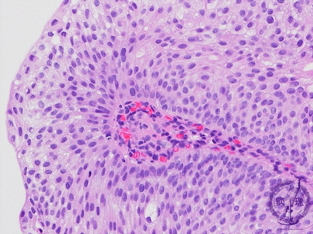 ミクロ像(HE強拡大): G1。癌細胞は7層を越えて乳頭状に増殖している。