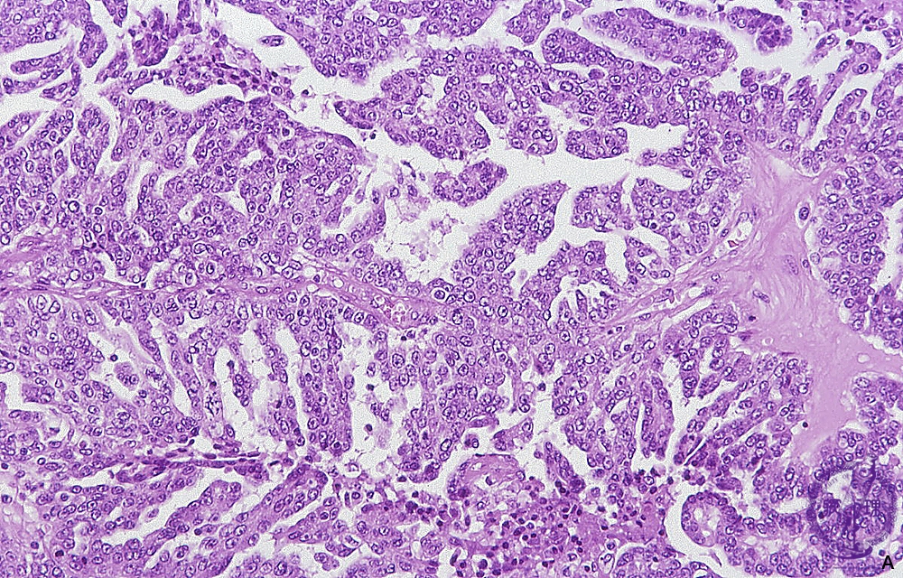 ミクロ像(HE中拡大):卵巣漿液性嚢胞腺癌。比較的小型で立方状の癌細胞が乳頭状に増殖している。