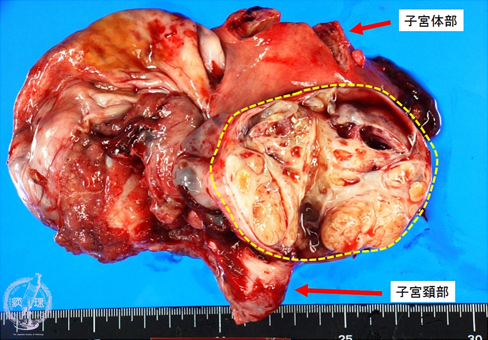 マクロ像(未固定新鮮標本):卵巣嚢胞内には黄色調の充実性腫瘍(黄色点線)が認められる。