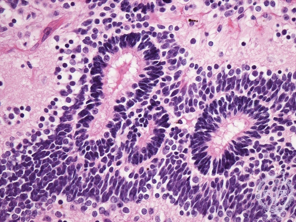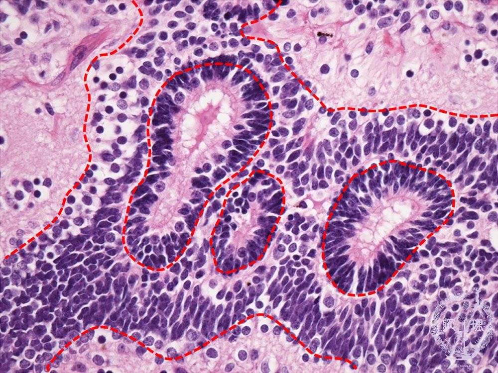 ミクロ像(HE強拡大):未熟奇形腫。神経管様の未熟な神経上皮性組織が認められる(赤色点線)。