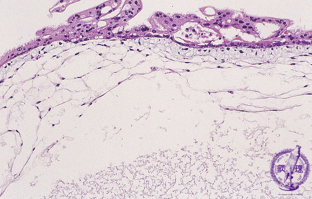 ミクロ像(HE中拡大):水腫状に腫大した絨毛で、間質の血管は認められない。絨毛上皮細胞の増殖が軽度認められる。