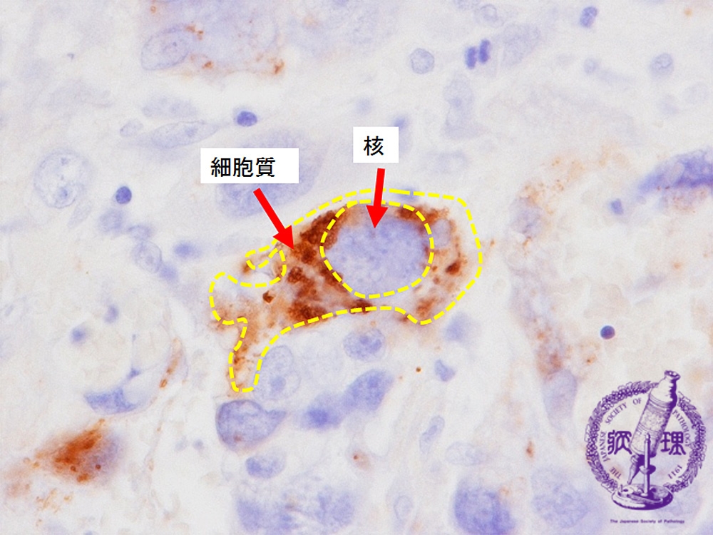 ミクロ像(ヒト絨毛性ゴナドトロピン(h-CG)免疫染色強拡大):腫瘍細胞の細胞質はh-CGに陽性である。
