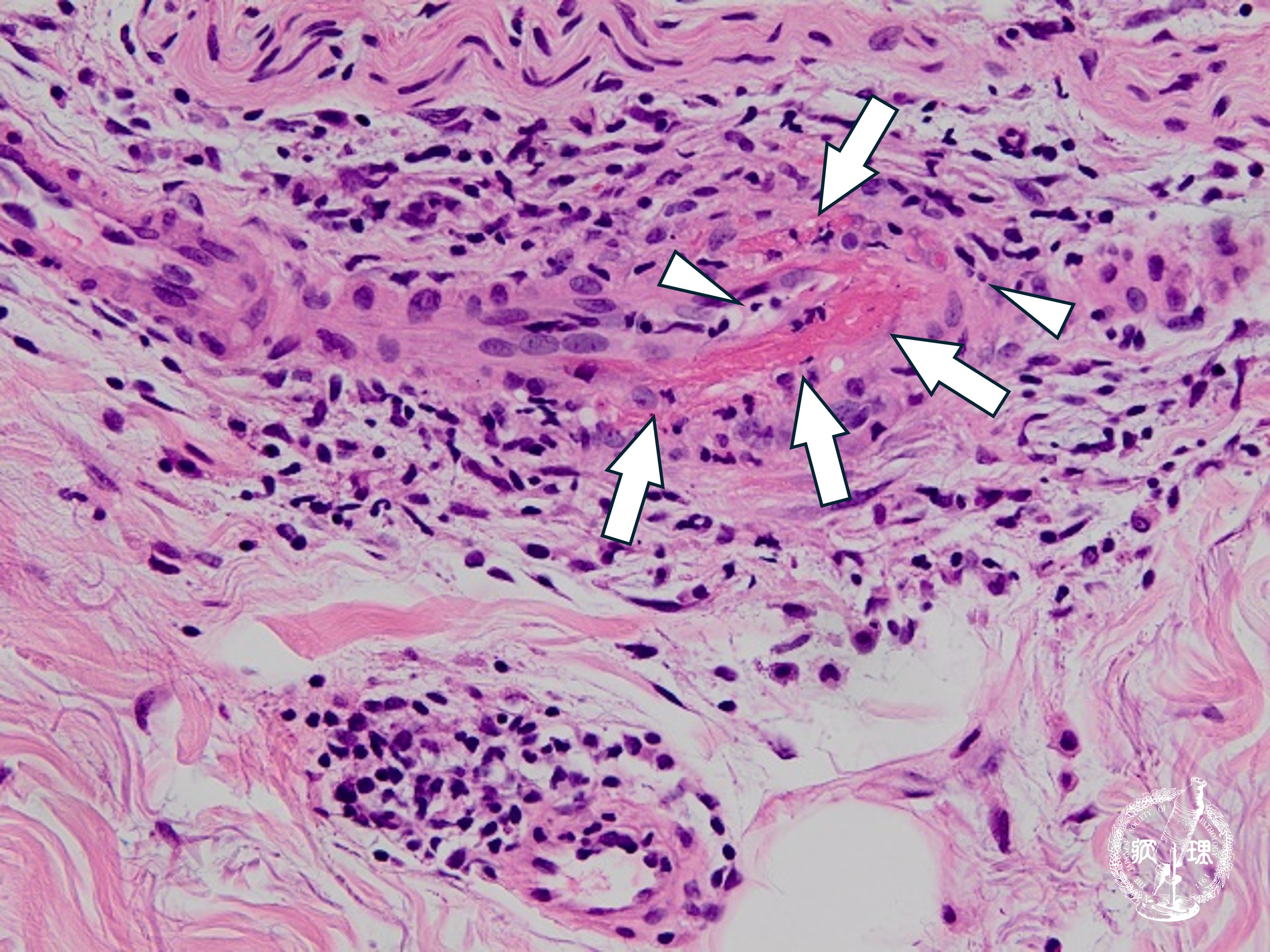 ミクロ像 (HE中拡大): 真皮の細動脈・細静脈・毛細血管レベルの血管にフィブリノイド壊死を伴う血管炎を認める(矢印)。核片(白血球破砕像)(矢頭)も認める。