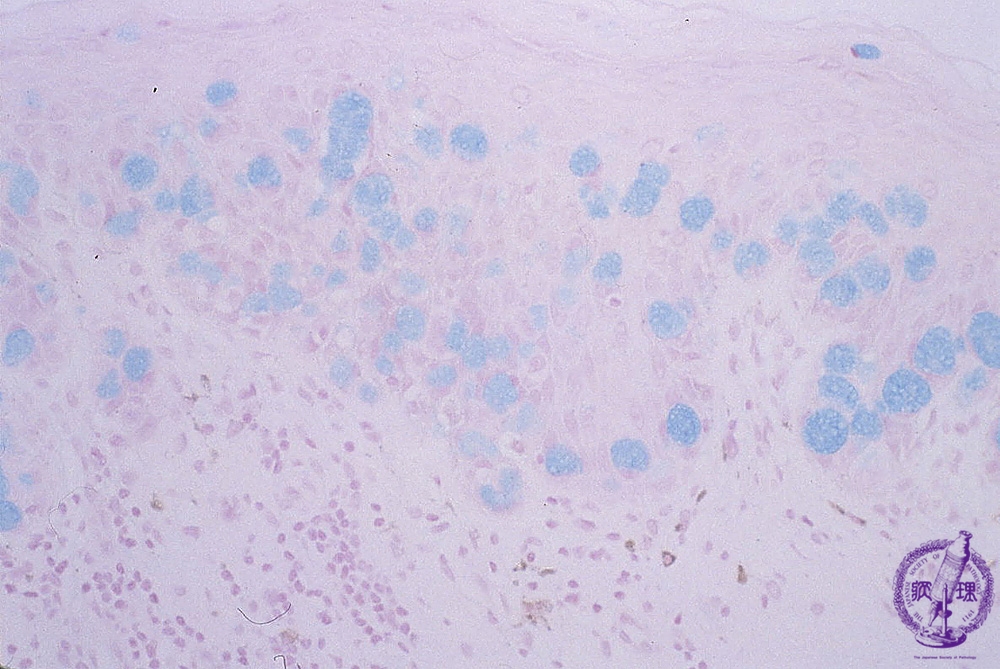ミクロ像(アルシアン青(alcian blue)染色強拡大):Paget細胞はムコ多糖を含有し、alcian blue染色やPAS染色で細胞質が陽性所見を示す。
