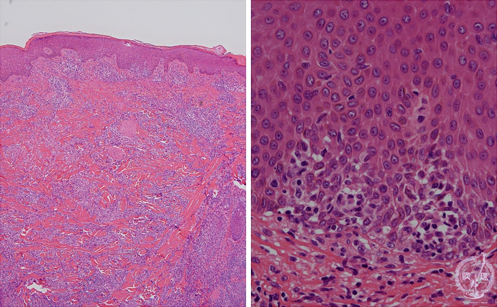ミクロ像(HE左弱拡大、右強拡大):進行すると(写真は腫瘍期)、リンパ腫細胞が真皮でびまん性に増殖。表皮への浸潤傾向も見られる(円内)。