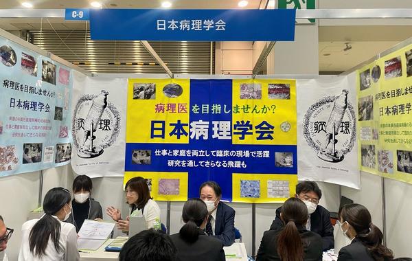 病理医・研究医の育成とリクルート委員会の主要な活動の1つとして、総勢12名【宮崎(岐阜大)、藤井・上田(横浜市大)、大橋(東京科学大)、佐藤(埼玉医大)、竹内(京都大)、秋山(川崎医大)、小林(藤田医大)、小川(成田赤十字病院)、前田(名古屋大)、加藤・松平(病理学会事務局)】で、6月29日(日)レジナビフェア2025 in 東京(東京ビッグサイト)に参加した。十分なコロナ対策のもとに実施された。病理医の医学生への認知度はかなり上がっており、11時の開始直後から学生・研修医の訪問が途切れることはなかった。