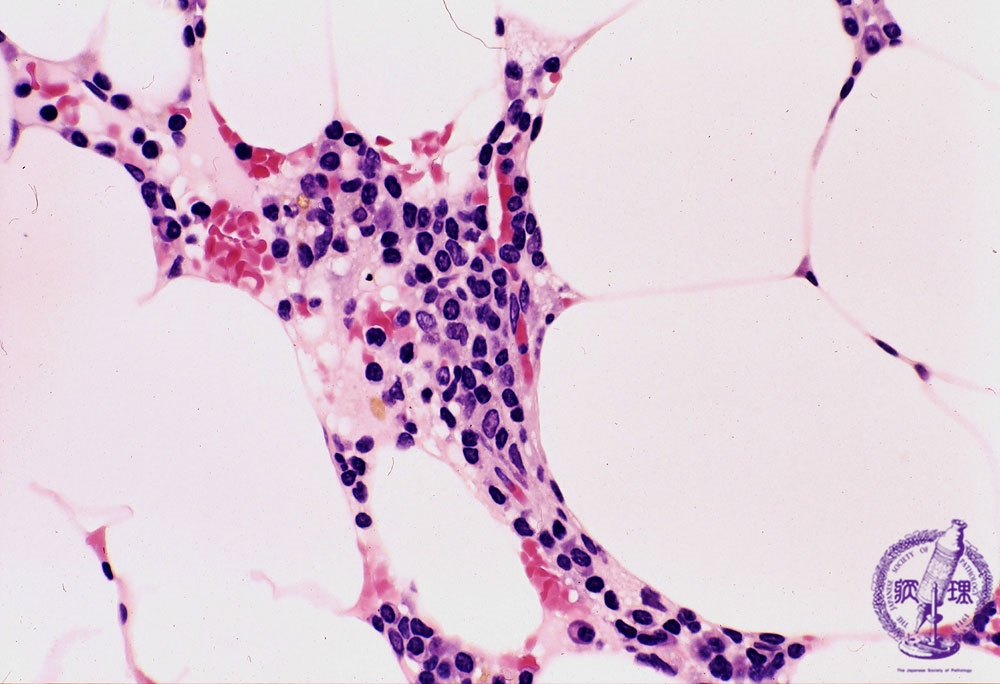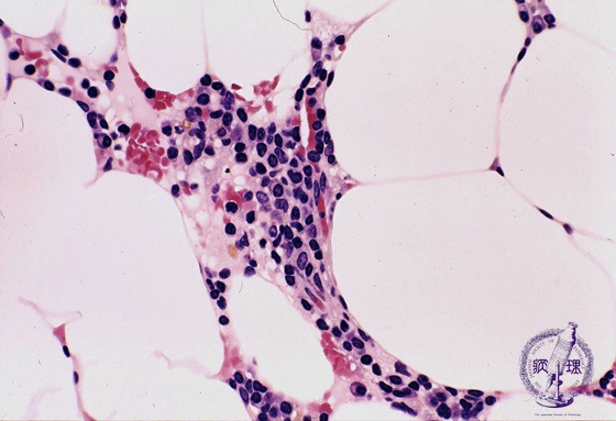 Microscopic image (H&E high power view): The marrow is markedly hypocellular with very few nests of cells. Most of the observed cells are lymphocytes with a small number of plasma cells and granulocytes.