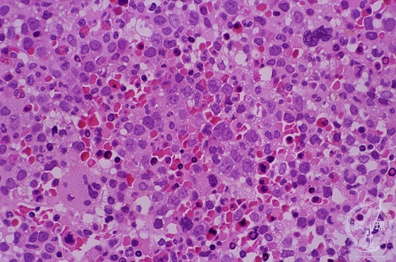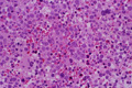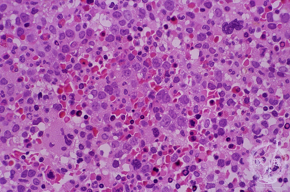 Microscopic image (H&E high power view): Although an anemia is found in the peripheral blood, bone marrow shows marked hypercellularity with increased erythroblasts forming small aggregates. Megaloblasts have a relatively fine chromatin and the marked nucleoli (arrows). This type of anemia occurs due to the exhaustion of Vitamin B12 or folic acid by insufficient intake, malabsorption and/or excessive consumption.