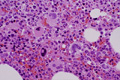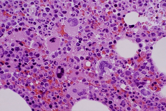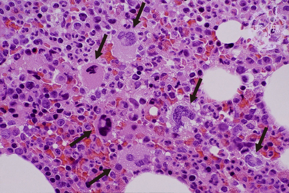 Microscopic image (H&E high power view): Full ranges of hematopoietic cells are found without an increase of blasts. There is an increase of megakaryocytes in the marrow corresponding to the destruction of platelets in the peripheral blood. (In this picture at least 6 megakaryocytes are observed (arrows). In normal marrow, one to two megakaryocytes are usually found in the field with the same magnification.)