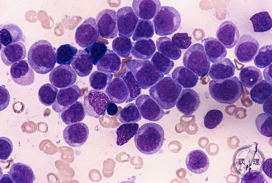 Microscopic image (marrow aspirates: Giemsa staining): The myeloblasts have delicate nuclear chromatin and folded nuclear membranes. The nuclei are not always kidney-shaped.