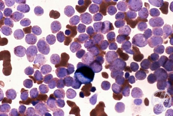 Microscopic image (marrow aspirates: Esterase-double staining): There are many monoblasts with fine and brown granules in the cytoplasm. There are a few myeloblasts with neutrophilic differentiation (blue).