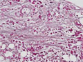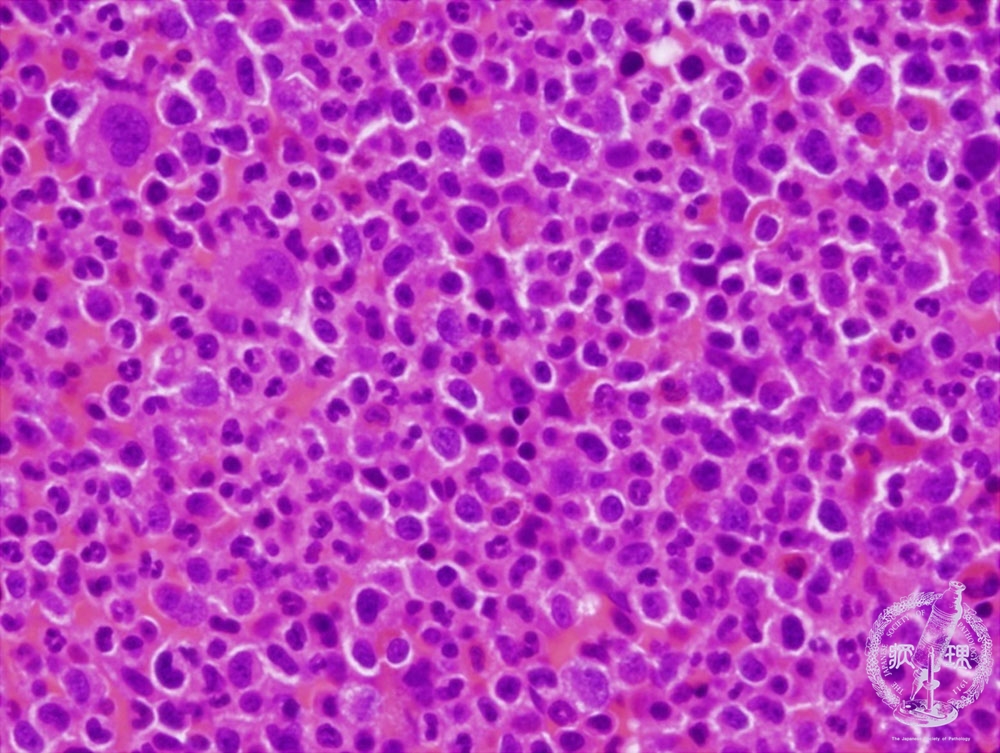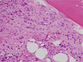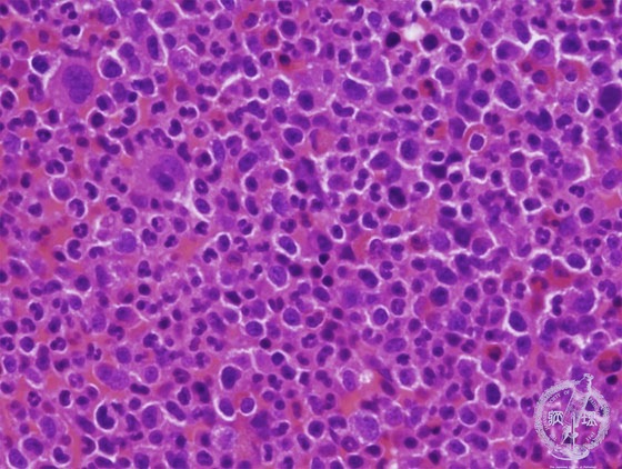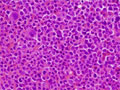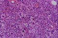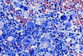 Microscopic image (H&E high power view): The marrow is markedly hypercellular with an increased number of granulocytes and megakaryocytes.