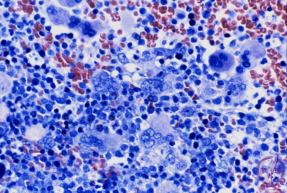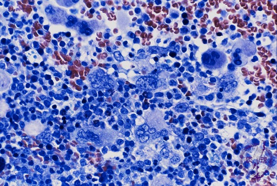 Microscopic image (marrow aspirates: Giemsa staining high power view): The marrow is markedly hypercellular with an increased number of granulocytes and megakaryocytes. In the chronic phase like depicted in this picture, marked proliferation of myeloblasts is occasionally seen.