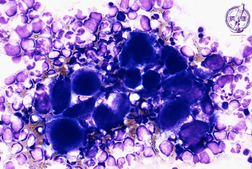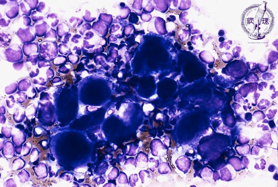 Microscopic image (marrow aspirates: Giemsa staining): The megakaryocytes are found in aggregates, as well as the granulocytes.