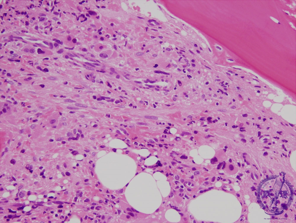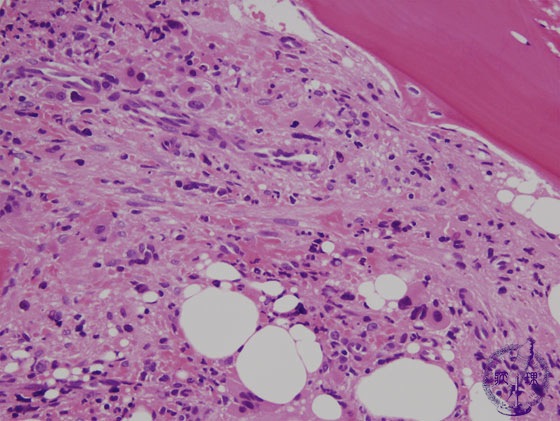 Microscopic image (H&E high power view): Fibroblasts are also proliferating in the hypercellular marrow. As with fibroblasts proliferation, marked deformity is observed in hematopoietic cells. Megakaryocytes are numerous. The pale pink fibrous tissue is found in the background.