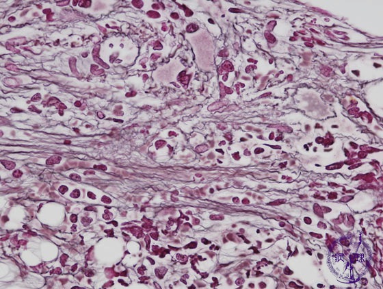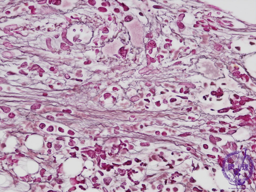 Microscopic image (reticulin stain, high power view): Black reticulin fibers are conspicuous in contrast with the normal marrow which rarely contains reticulin fibers.