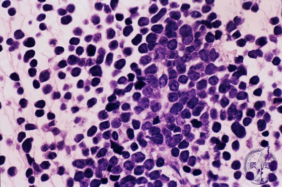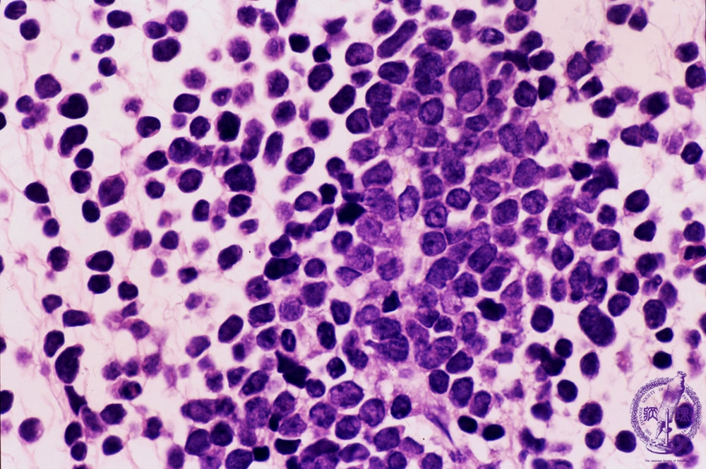 Microscopic image (H&E high power view): The marrow is hypercellular and packed with a high N/C ratio, atypical lymphoid cells. This is the picture of ALL (L1 by FAB classification).