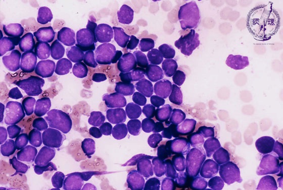 Microscopic image (marrow aspirates: Giemsa staining): The tumor cells have an extremely high N/C ratio. Many cells have irregular-shaped nuclei with a convoluted appearance.