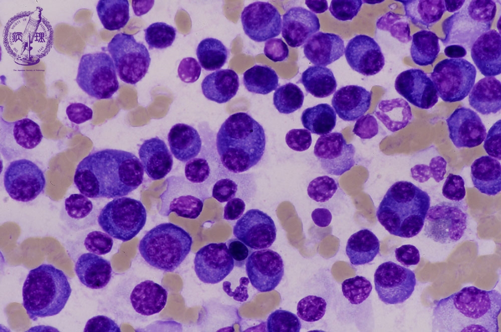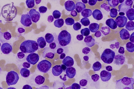 Microscopic image (marrow aspirates: Giemsa staining): The tumor cells resemble plasma cells due in part to having eccentrically placed nuclei. However, many cells have multiple nuclei and prominent nucleoli.