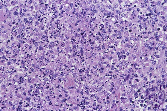 Microscopic image (H&E high power view): There are numerous apoptotic bodies and nuclear debris admixed with macrophages and large transformed lymphocytes. However, in comparison with the previous image a neutrophil, eosinophil or plasma cell inflammatory response is lacking.