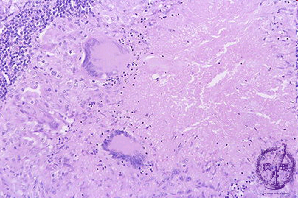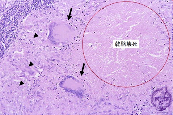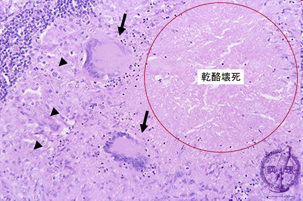 Microscopic image (H&E high power view): In the vicinity of caseous necrosis (circle) are “epithelioid” histiocytes (arrow head) which resemble epithelial cells on account of their round nuclei and abundant pink cytoplasm. The latter cells fuse to form Langerhans giant cells (arrow) with multiple, eccentrically situated nuclei. These can also be seen scattered throughout.