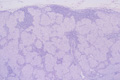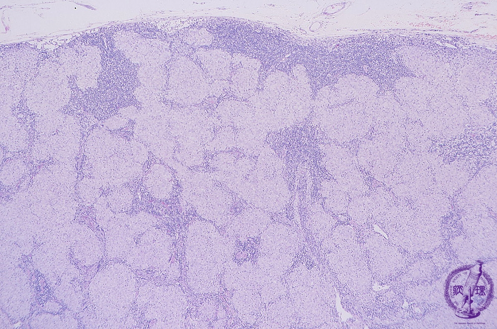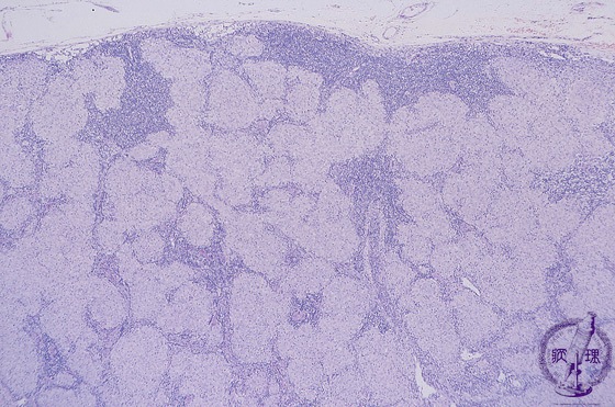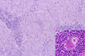 Microscopic image (H&E low power view): Within lymph nodes, numerous pale pink epithelioid histiocytes are seen in band like and nodular formations. Nodules are of relatively uniform size.