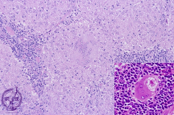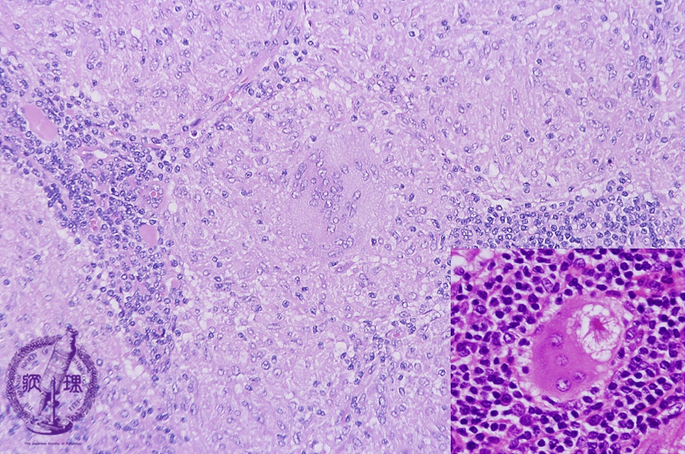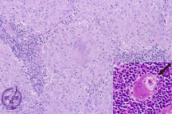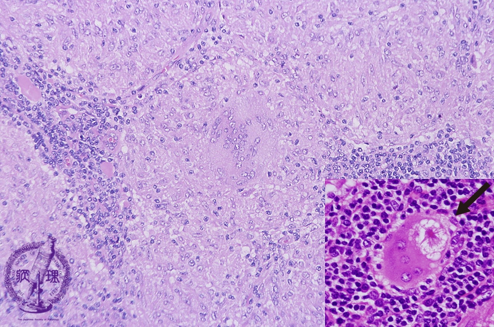 Microscopic image (H&E high power view): Again, epithelioid histiocytes with round nuclei and abundant cytoplasm are seen. Some areas share a strong histologic resemblance to the lesions seen in tuberculosis. However, the lack of necrosis is an important diagnostic point which helps to differentiate sarcoidosis. Langerhans giant cells, again seen here, are a constant feature but their prominence and numbers will vary. An “asteroid” body is also present (arrow at lower right).