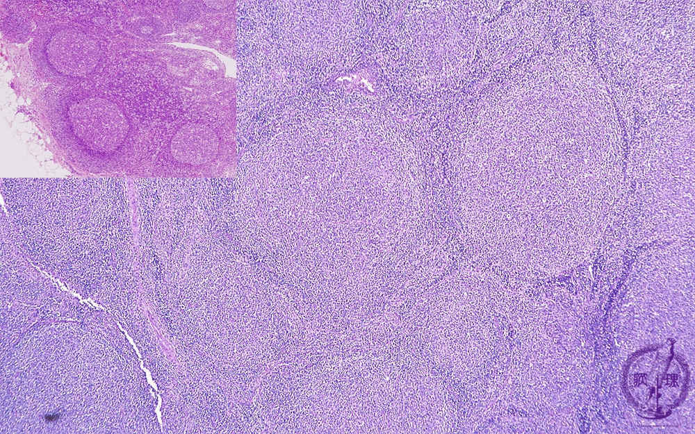 Microscopic image (H&E low power view): There are numerous large follicles with indistinct borders and these typically efface the entire lymph node architecture. These neoplastic follicles are variably spaced and may be confluent. In contrast, non-neoplastic interfollicular spaces are typically wide (upper left inset).