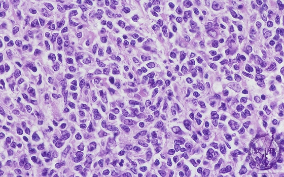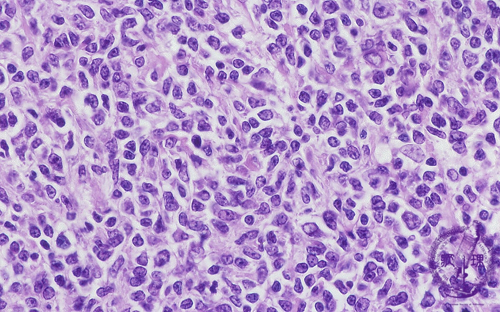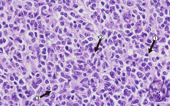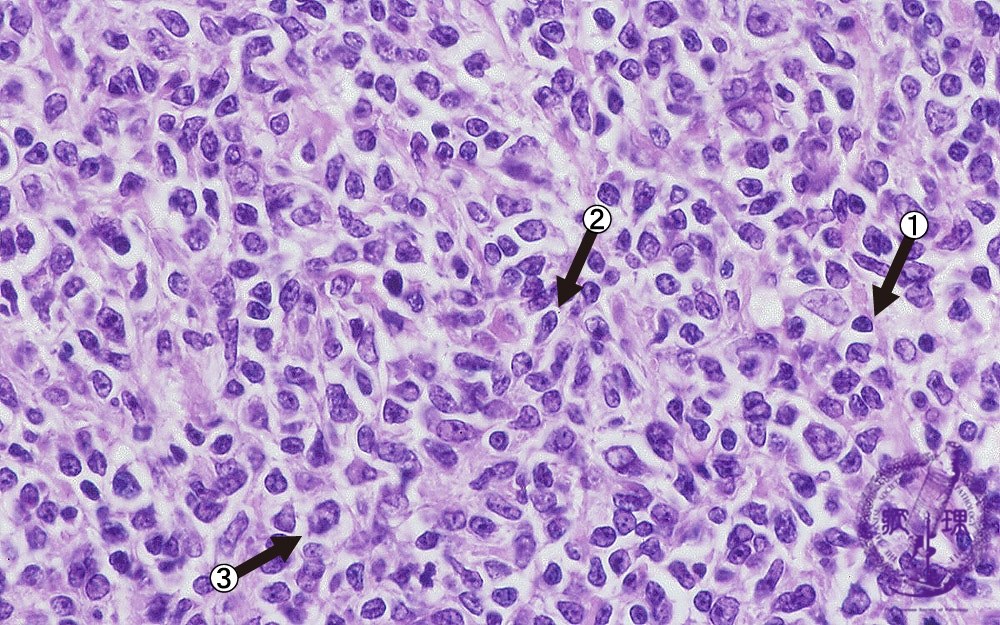 Microscopic image (H&E high power view): Nuclei of neoplastic lymphocytes are larger than those of mature lymphocytes (arrow No.1), but smaller than those of histiocytes. Some of the smaller tumor cells are called cleaved cells because their nuclei have irregular, notched borders (arrow No.2). Admixed centroblasts (arrow No.3) are larger tumor cells with prominent large nucleoli. The germinal center growth pattern is relatively monotonous in contrast to the heterologous appearance seen in non-neoplastic, reactive areas.