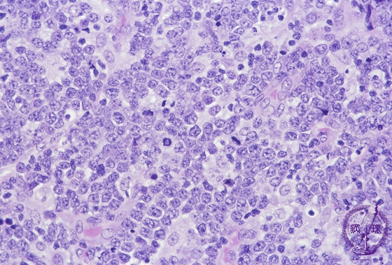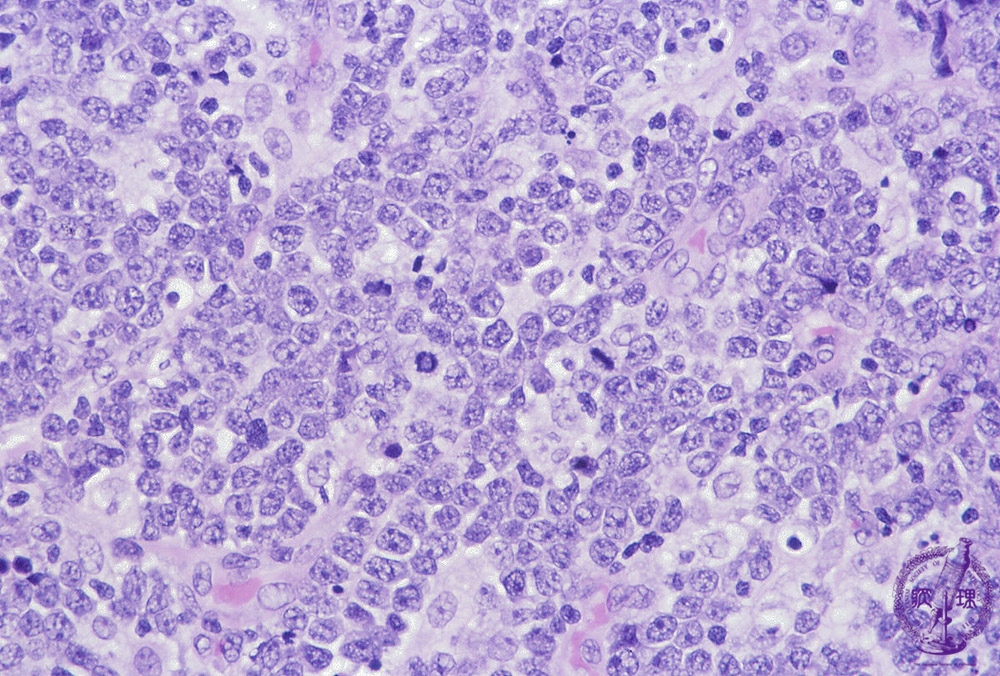 Microscopic image (H&E high power view): There is a diffuse proliferation comprised of small blast cells which contain scant cytoplasm and frequently display mitotic figures. Burkitt lymphoma primarily affects children and young adults. An association with EB virus (Epstein-Barr virus: EBV) is documented. Abnormally increased c-Myc gene expression is due to chromosomal translocation [t(8;14)].