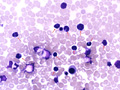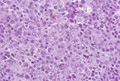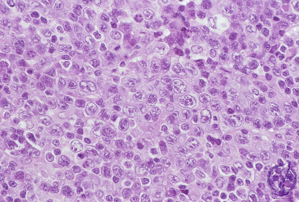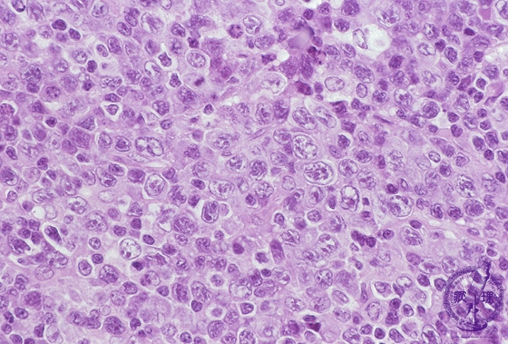 Microscopic image (H&E, high power view): A diffuse proliferation of large, exceedingly atypical tumor cells effaces the underlying lymph node follicular architecture.