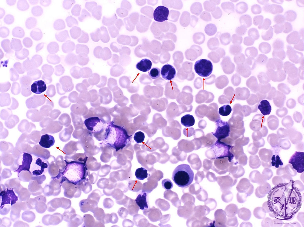 Microscopic image (peripheral blood smear: Giemsa staining): Bone marrow aspirate and peripheral blood smears show neoplastic cells whose nuclei show numerous notches which has led to the designation gflower cellsh (arrows). The latter cells are typically observed only in smear (cytological) specimens.