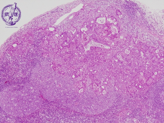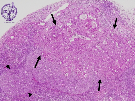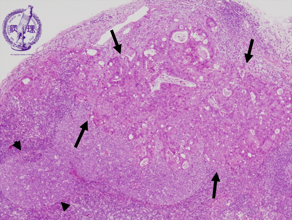 Microscopic image (H&E low power view): Nests of gland-forming adenocarcinoma (colon cancer) are found in the subcapsular sinus (arrows). The lymph node follicular structure is relatively preserved and follicles are often rather large (arrow heads). In general, cancer metastasizes via the lymphatic system. Consequently, metastatic disease is typically first seen in the subcapsular sinus where the lymph fluid enters the lymph node.