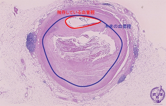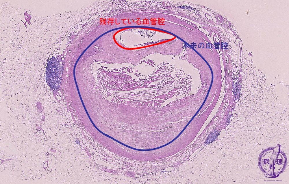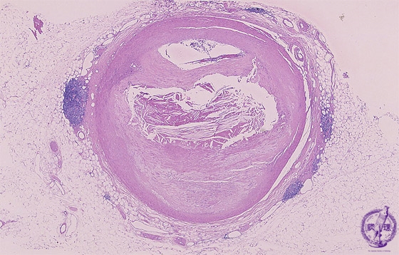 Microscopic view (HE, low power view): There is severe stenosis of the coronary artery due to atherosclerosis demonstrated here by eccentric intimal wall thickening and extracellular lipid deposition.
