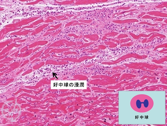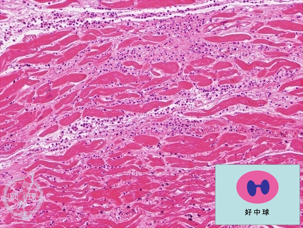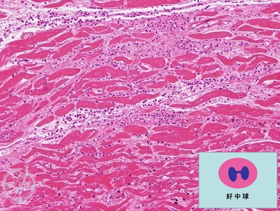 Microscopic image (HE, low power): At 1 day following acute myocardial infarction, there is myocyte necrosis and an associated polymorphonuclear cell infiltration.