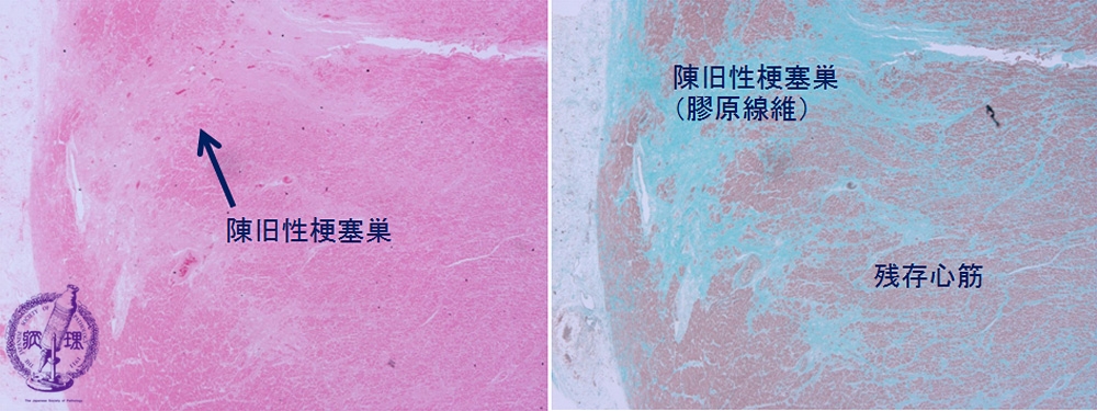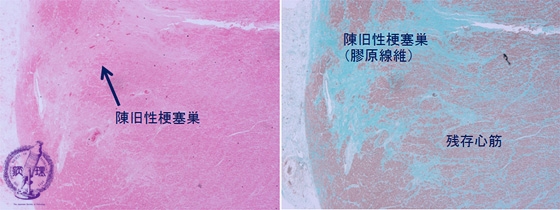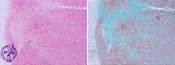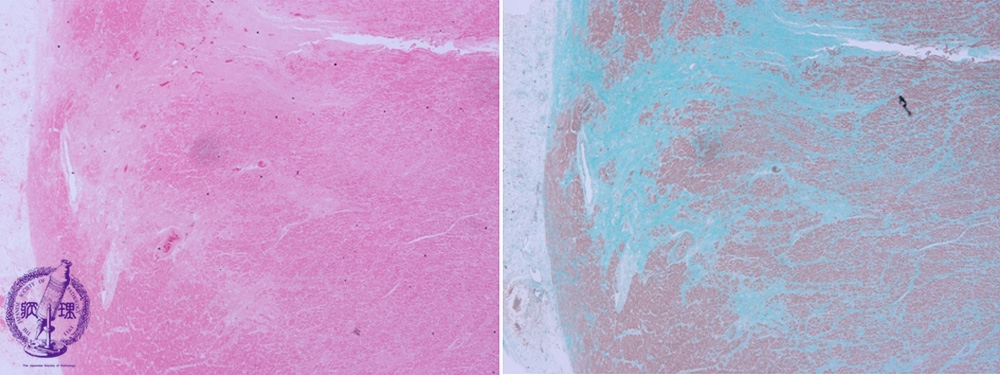 Microscopic image, low power: (left: HE; right: Masson trichrome stain): After 3 months, scar tissue is seen replacing the necrotic focus. The latter is highlighted by a Masson trichrome stain (muscle fibers stain red and collagen fibers stain bluish green).