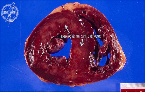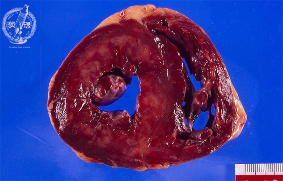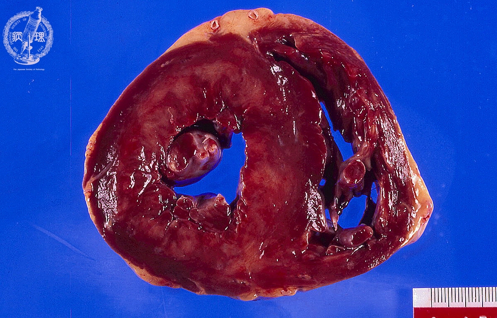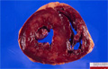 Macroscopic view (fulminant viral myocarditis): There are multiple patchy, discolored areas as well as striking edema of the myocardium demonstrated by a reddish appearance and soft consistency.