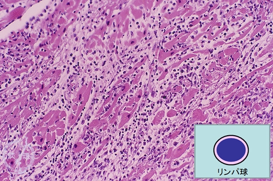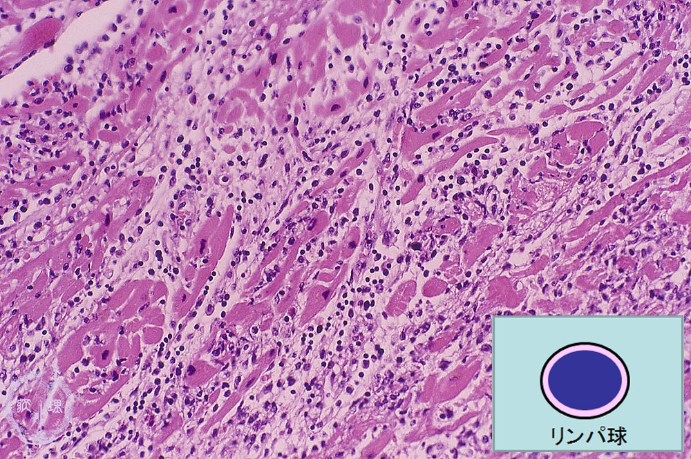 Microscopic image (HE, low power view): There is a marked inflammatory cell infiltrate consisting mainly of lymphocytes. Islands of entrapped myocardium show prominent necrotic change.