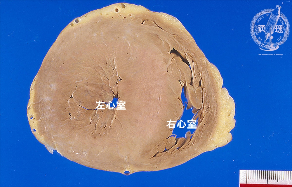 Macroscopic view (Hypertrophic cardiomyopathy): CT cross-section at the ventricular level shows striking left ventricular cavity narrowing and prominent thickening of the ventricular septum (normal thickness is around 15 mm).Please click here to compare with dilated cardiomyopathy.