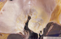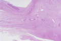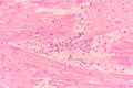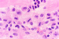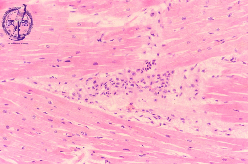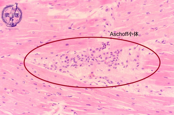 Microscopic image (HE, low power view): The so-called Aschoff nodule, which is a classic finding in rheumatic fever, comprises a nodular inflammatory cell infiltrate within the myocardium and is composed of T cells and activated macrophages.